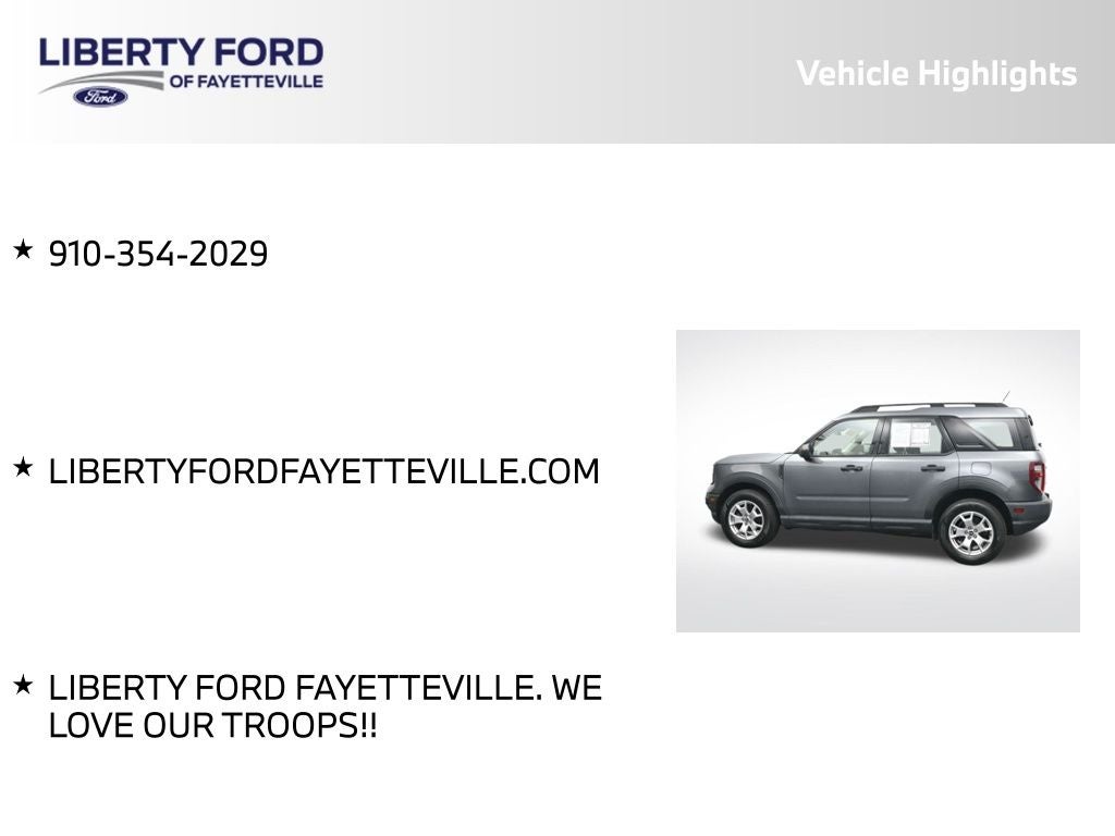 At Liberty Ford Fayetteville, we're committed to making your car-buying experience exceptional. This 2021 Bronco Sport Base is priced at just $16,898, and with our $1,000 discount for using dealer financing, it's an unbeatable value. Don't miss your chance to own this capable and well-equipped SUV. Visit us today and let us show you why the Bronco Sport Base is the perfect choice for your next vehicle.